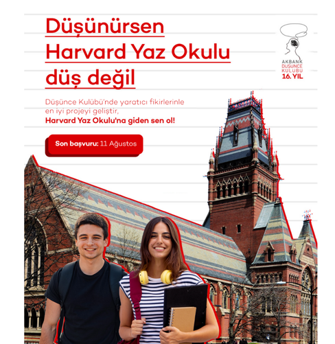 Akbank Gençlik Akademisi Harvard’a Yolluyor Fikirlerine ve yaratıcılığına güveniyorsan, Akbank Düşünce Kulübü’nün programına katıl, projeni geliştir. En iyi fikir ve projenin sahibi Harvard Yaz Okulu’na gidiyor!