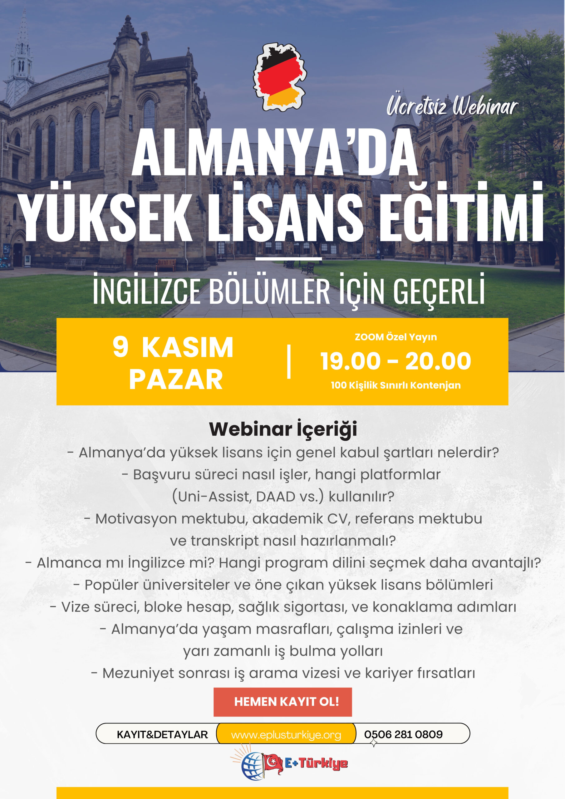 Almanya’da yüksek lisans yapmak isteyen mezunlar ve son sınıf öğrencileri için hazırlanan bu çevrimiçi buluşmada, akademik kabul süreçlerinden yaşam koşullarına, dil yeterliliklerinden kariyer planlamasına kadar tüm aşamalar profesyonel olarak ele alınacak.