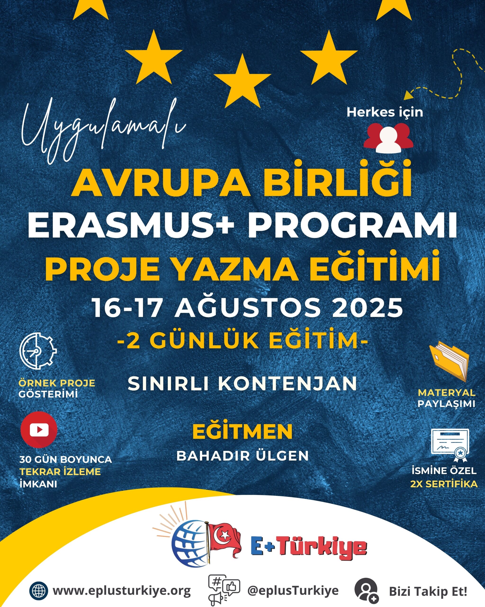 Avrupa Birliği fon programı olan Erasmus+ başta olmak üzere çeşitli kurum ve kuruluşlara nasıl proje yazılacağını, sunulacağını ve yönetileceğini tüm detaylarıyla teorikte öğreneceğiniz ve uygulamalı olarak hayalinizdeki projeyi yazacağınız bir eğitim sizleri bekliyor!