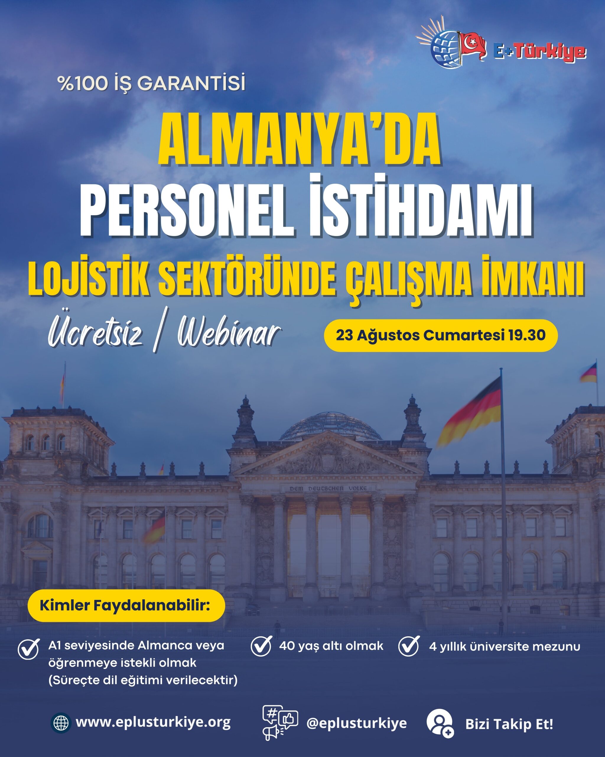 Devamını OkuAlmanya’da Personel İstihdamı ve Lojistik Sektöründe Çalışma İmkânı Ücretsiz Webinar 📆 Tarih: 23 Ağustos 2025, Cumartesi🕖 Saat: 19.30📍 Platform: Zoom (Kayıt olan katılımcılara giriş bilgileri paylaşılacaktır) Webinar Hakkında E+Türkiye olarak düzenlediğimiz bu özel webinar, Almanya’da lojistik sektöründe yasal istihdam fırsatları hakkında kapsamlı bilgi sunmayı hedefliyor. Üniversite mezunu kişiler için paketleme, dağıtım ve hava kargo gibi alanlarda iş bulma ve Almanya’ya yasal […]