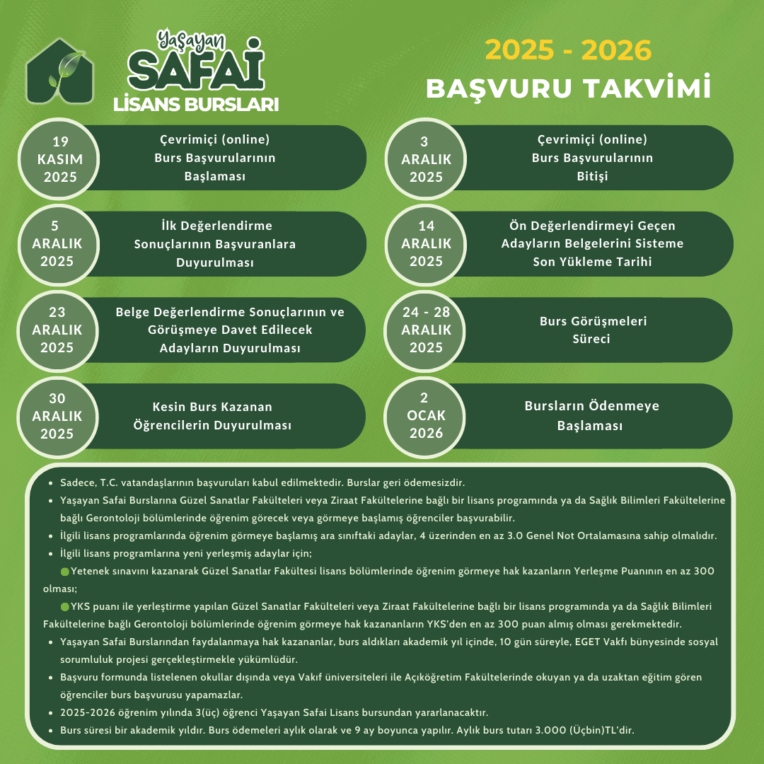 EGET Vakfı Yaşayan Safai Bursu Vefat eden EGET Vakfı kurucularından Safai’nin anısını yaşatmak amacıyla hayata geçirilen Yaşayan Safai Bursu, öğrencilere destek vermektedir. 📅 Başvuru Dönemi: 2025–2026 akademik yılı için başvurular 19 Kasım – 3 Aralık 2025 tarihleri arasında kabul edilecektir. 💰 Bursun Süresi ve Tutarı: Yılda toplam 9 ay boyunca (Ekim–Haziran) Her ay 3.000 TL ödeme yapılacaktır. 📅 Başvuru Takvimi (2025–2026) 19 Kasım – 3 Aralık: Başvuruların […]