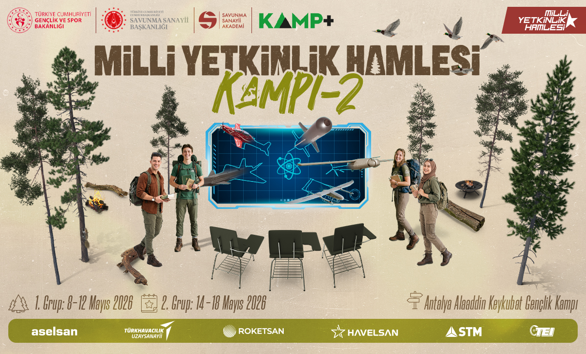 T.C. Gençlik ve Spor Bakanlığı ile T.C. Cumhurbaşkanlığı Savunma Sanayii Başkanlığı iş birliğinde hayata geçirilen “Milli Yetkinlik Hamlesi Kampı – II” gençlerle buluşuyor! Antalya Alaaddin Keykubat Gençlik Kampı’nın ev sahipliğinde; tematik ve teknik eğitimler, atölyeler, kamp aktiviteleri, ürün hikayeleri ve savunma sanayiinin eşsiz içerikleriyle dolu bir program sizleri bekliyor.